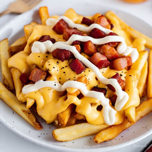 Poção de 500g de batata frita com molho de cheddar cremoso, com molho de baconese e bacon.