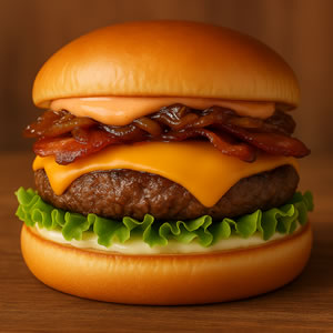 Pão Especial Tostado com Manteiga na Chapa, Maionese, Alface, Carne Artesanal 180g, Cheddar, Molho Especial, Bacon e Cebola Caramelizada.